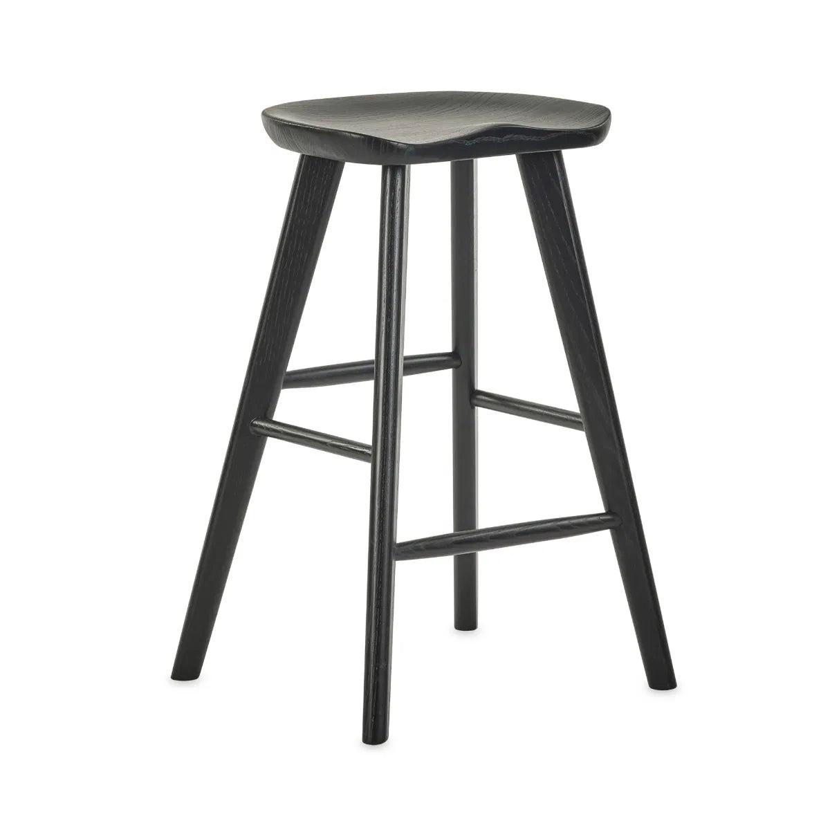 This timeless black bar stool combines practical style with everyday comfort, making it a smart choice for kitchen islands, breakfast bars, or casual seating areas. Finished in a classic matte black, the gently curved saddle seat features a subtle contour for ergonomic support, while the splayed legs and built-in footrest provide added stability. Compact and easy to assemble, with all legs included.