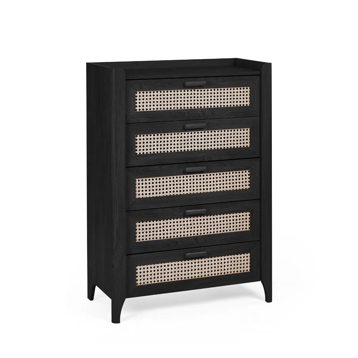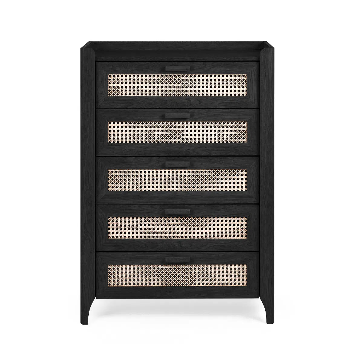 A beautifully sleek design with a bohemian feel, the Sydney 5 Drawer offers exquisitely curved edging accompanied by a raised lip around the edge providing a practical addition, stunningly combined with a rattan-effect sticker front. Finished with a natural oak effect or black ash featuring five spacious drawers to store away any clothing and accessories with gloved handles for easy access. Creating the perfect airy, warm feel around your home.