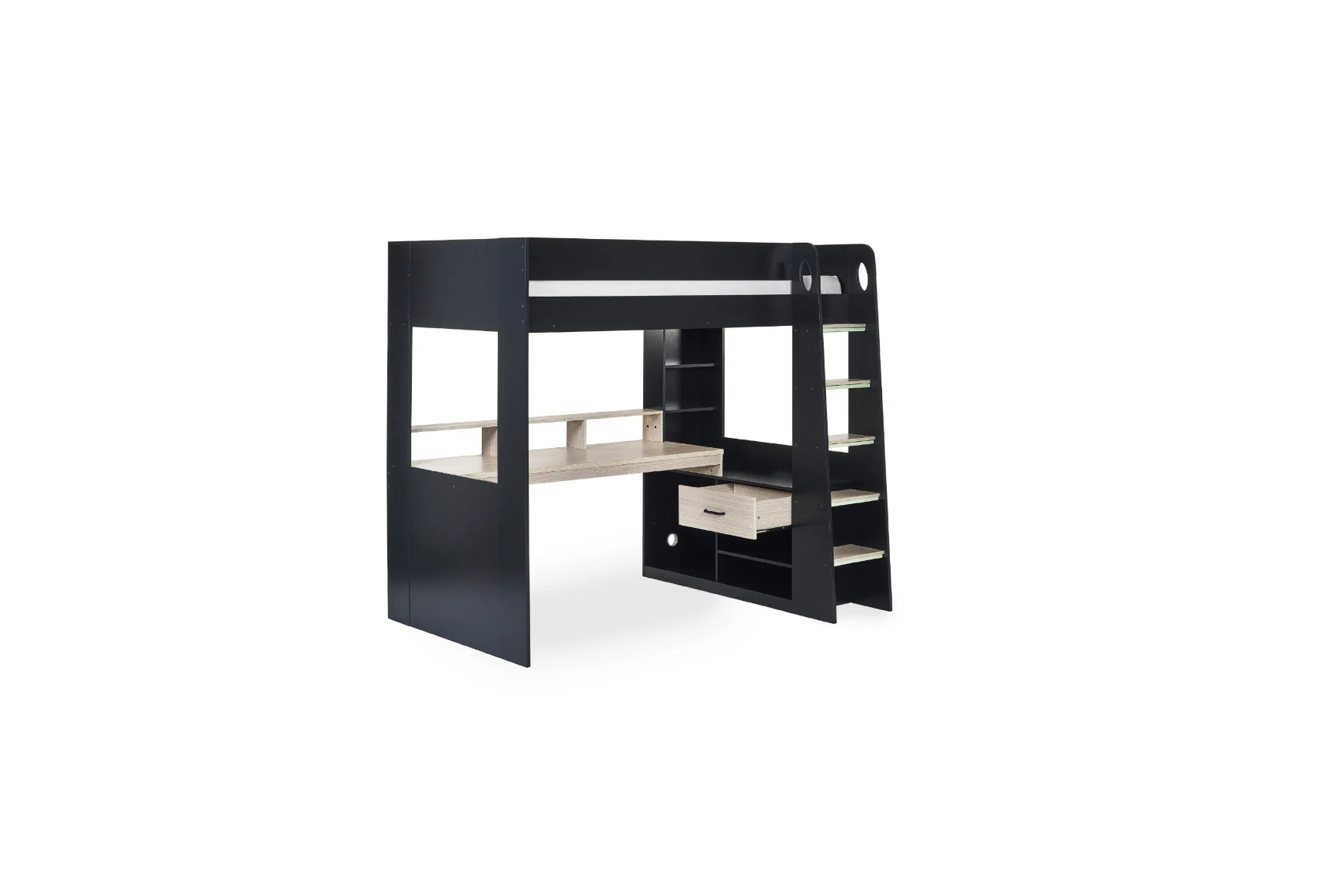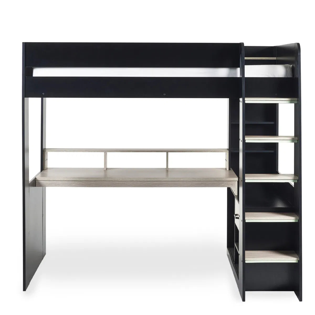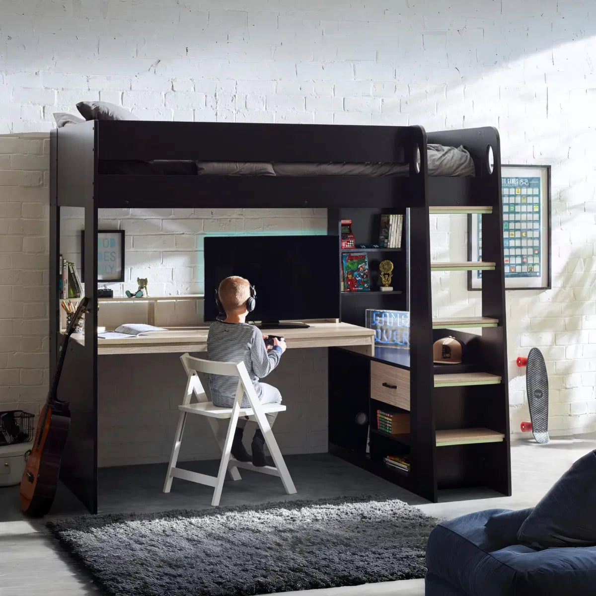 Step into the gaming sanctuary of your dreams with the Blaze Gaming Highsleeper – an exquisite fusion of style and functionality. This expertly crafted bunk bed, with a black and pale woodgrain finish, is beautifully designed to be the ultimate haven for every gamer. Its built-in shelving and drawers seamlessly provide organised storage for gaming gear and essentials within arm's reach. The wide-span desk offers abundant space for any gaming setup, while raised platforms effortlessly cradle monitors, offering an immersive gaming experience. Glow-in-the-dark steps guarantee a secure ascent to the elevated gaming realm. Additionally, the bunk bed is available in a sleek white finish, presenting a diverse range of options to align with your personal style.