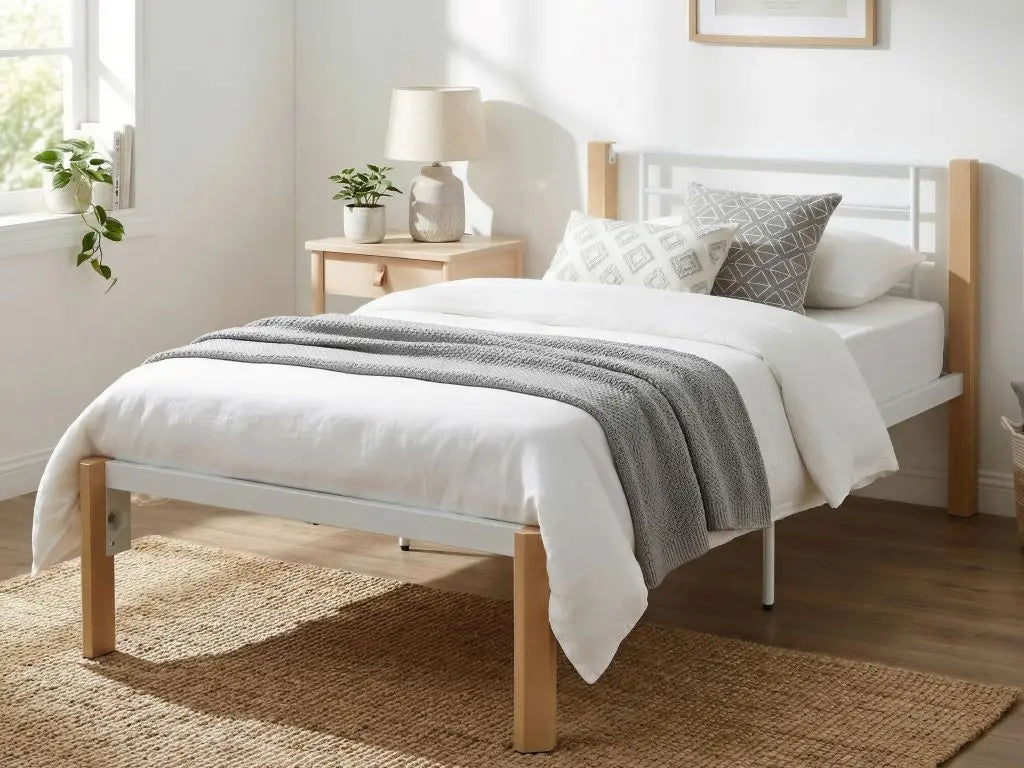 Sleek White Bed Frame – Bolt-Free with Wooden Effect Posts