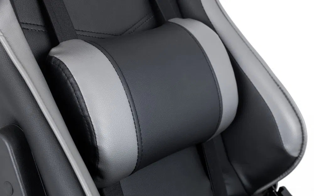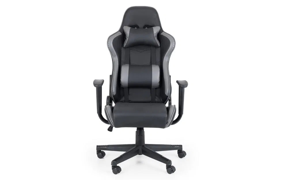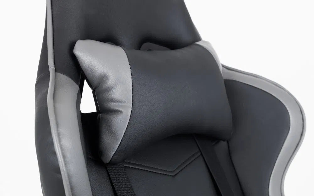 Get gaming with the Comet Gaming Chair. Upholstered in a modern black faux leather with grey accents, this gaming chair features a comfortable neck and lumbar support perfect for long hours of gaming or studying. The tilt mechanism makes this chair a delight to sit in allowing you to be at your utmost comfort whilst easily moving around upon the chairs 5 castor base.