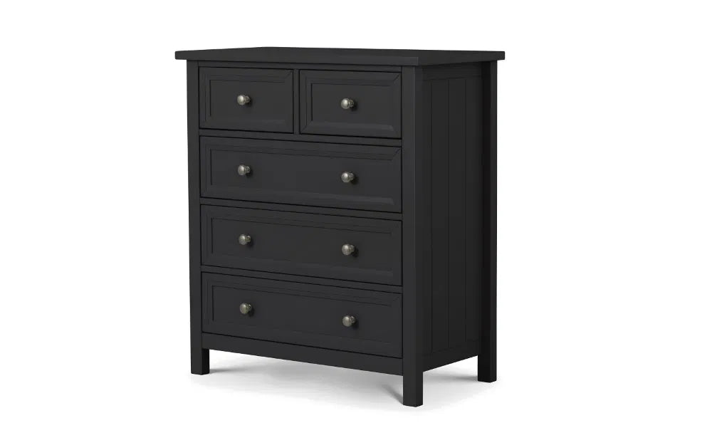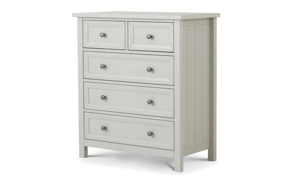 Maine is an elegant New England style range of bedroom furniture. The combination of exquisite dove grey lacquered finish with characteristic side panelling and detailed chamfered cabinetry makes for a soothing and refined aesthetic with timeless appeal, while delicate pewter handles add the perfect finishing touch. The Maine 3+2 drawer chest offers great storage with three large drawers topped with two smaller drawers.