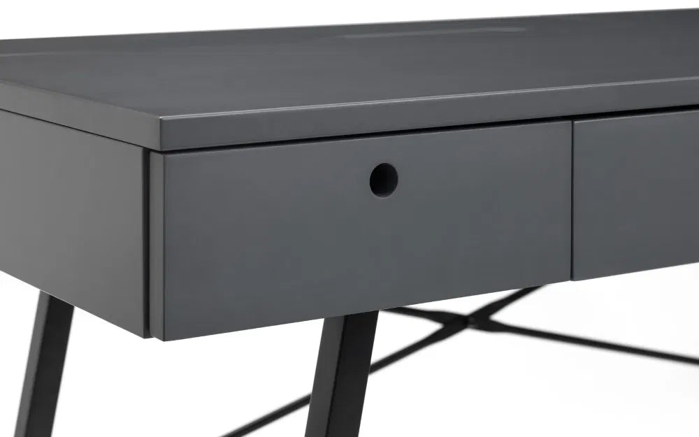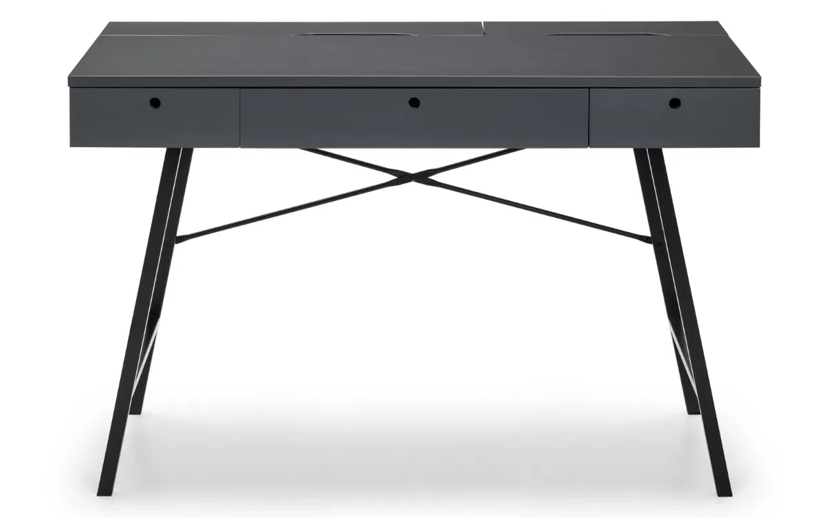 The Trianon Desk is the perfect addition to upgrade your workspace. This simple, Scandinavian design offers copious amounts of storage for your office supplies, featuring pull-out drawers at the front and 3 lift-up storage compartments with stunning recessed handles. The Trianon Desk is available in a grey or white finish upon slender, black metal legs, ideal for smaller working areas Height: 75cm x Length: 117cm x Width: 56cm