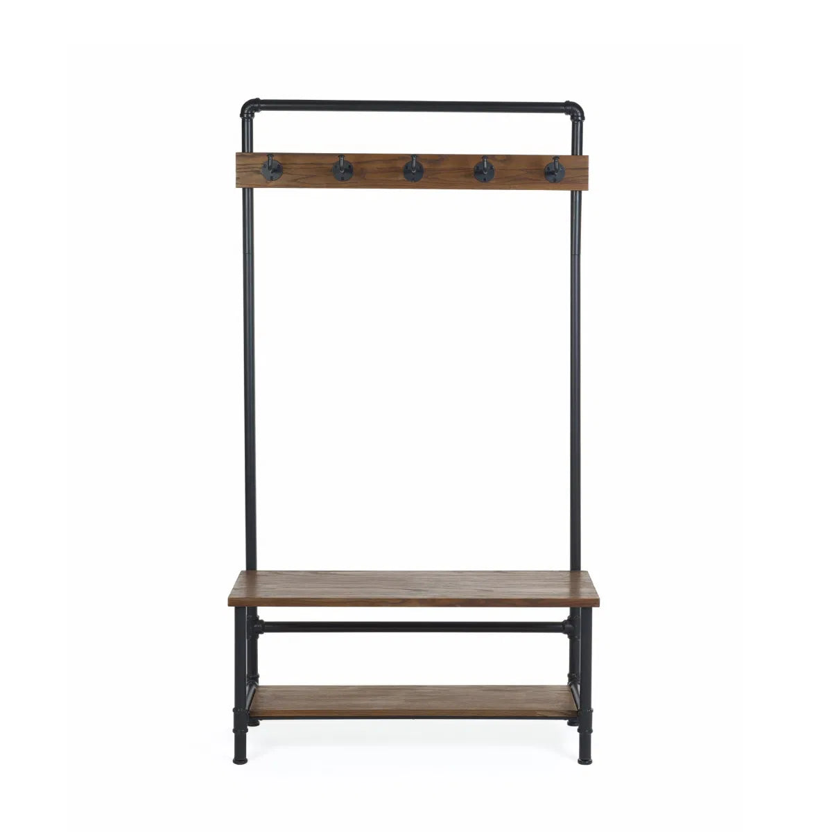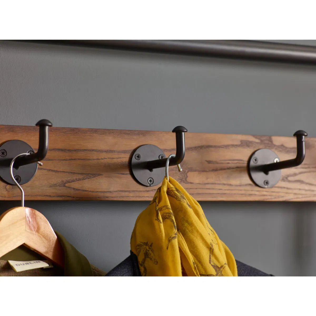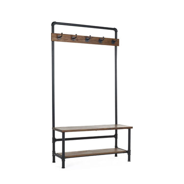 Make a statement in your entryway with the Boston Hallway Stand with Bench, seamlessly blending industrial design with practicality. Boasting sleek pipe legs crafted from powder coated steel for a modern touch to your home decor. With five black hooks provided, it is perfect for keeping coats and bags within easy reach. The built-in bench constructed from solid Elm wood in a luxurious mocha finish, and offers a cosy spot to sit whilst slipping on shoes, with ample storage space underneath for footwear and other essentials. Welcome guests in style with this chic and versatile addition to your home. Minimal assembly is required for your convenience.