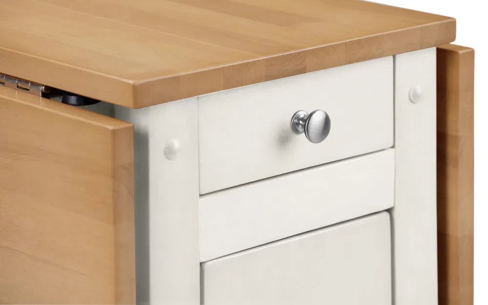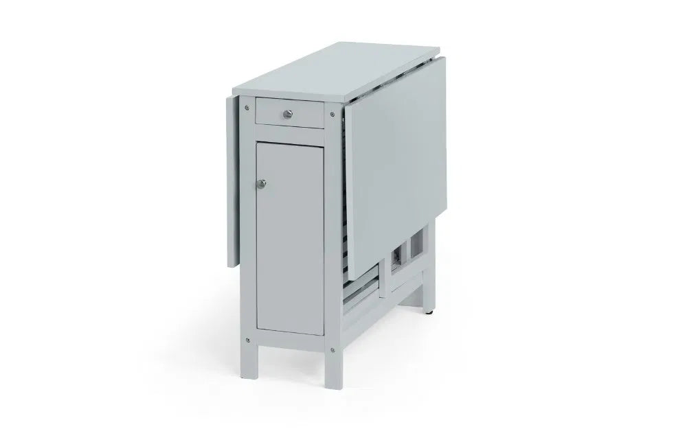 A neat and functional, space saving dining set where the chairs can be folded and stored Inside the table. This dining set is a timeless classic that features a integrated storage drawer, perfect for small spaces with less storage. Available in a light grey, white and natural, or an all over light oak finish.