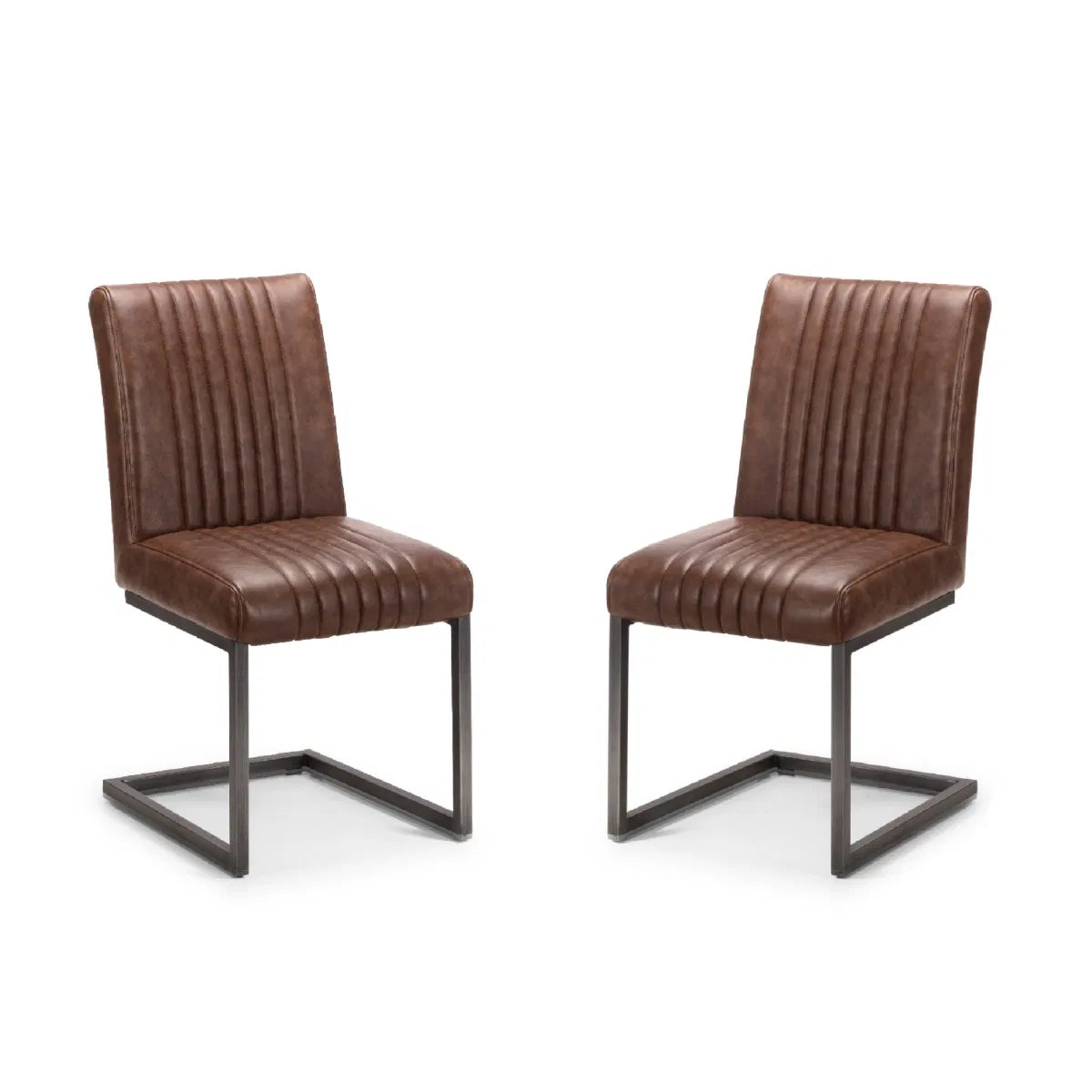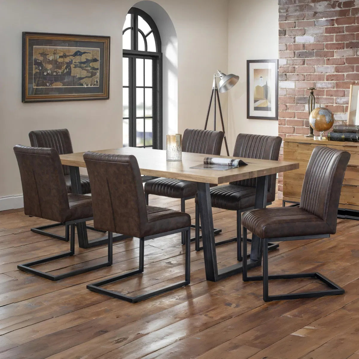 dining tableThe Brooklyn Dining Chair has an industrial, retro design in a vintage brown faux leather finish with a cantilever style gunmetal leg frame. Offering maximum comfort and style, this padded chair beautifully accompanies the Brooklyn Dining Table.