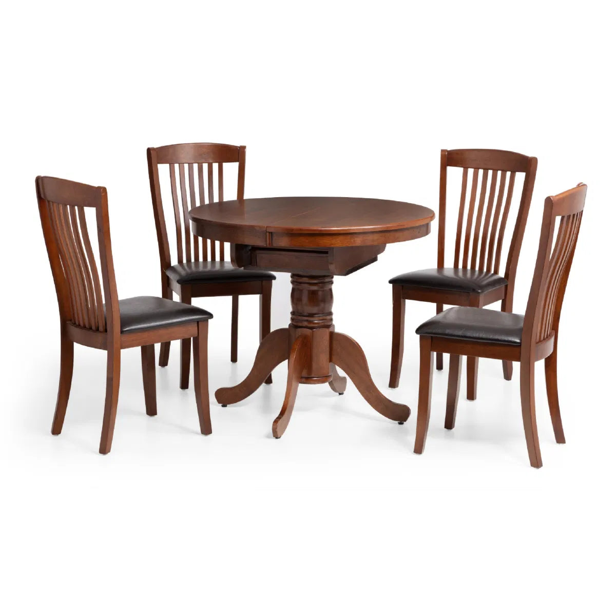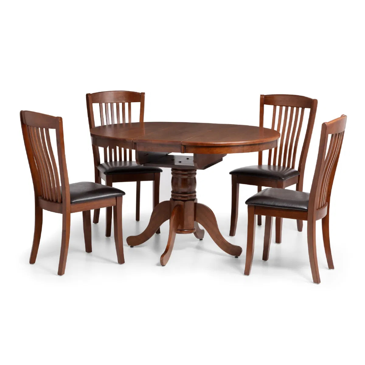 This Canterbury table brings a touch of elegance to any room, with its stylish pedestal base. Finished in a mahogany colour, this Canterbury table offers space saving practicality, extending to an oval table with can fit six people with an easy-to-use butterfly mechanism. Constructed from Solid Malaysian Hardwood, this traditional design will create a statement piece in your dining area.