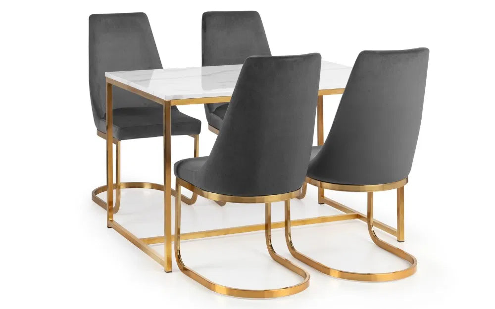 Scala is a sleek dining table with chic marble effect top on a well-crafted gold coloured, stainless steel frame or chrome frame. It has a timeless Italian design that fits well with a wide range of decorative styles. Part of the Julian Bowen Scala Dining and Occasional furniture range.