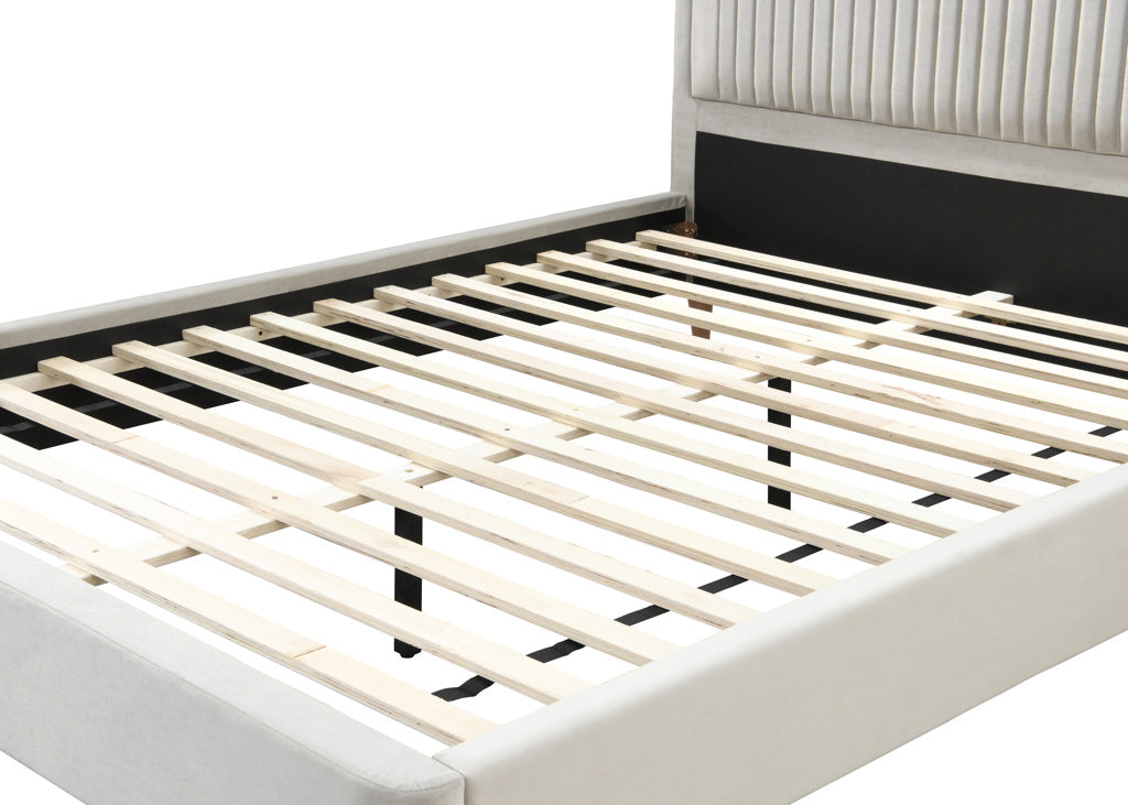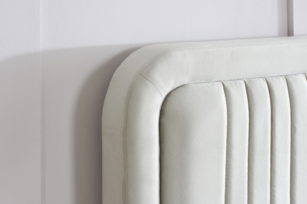Crafted in a warm stone fabric, this bed is the epitome of sophistication. The headboard, with its vertical channel detailing, offers a contemporary twist on classic design, providing both visual and tactile allure.
