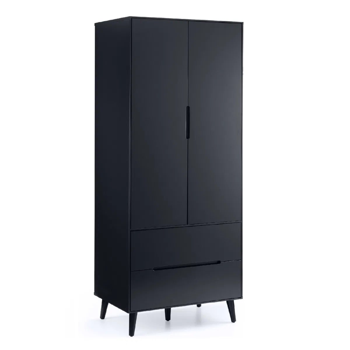 A stylish, retro-inspired combination wardrobe with two drawers in an immaculate matt white lacquered finish, with complementary tapered oak finish legs and recessed handles to provide easy opening. The sleek Scandinavian feel fits beautifully with any décor.