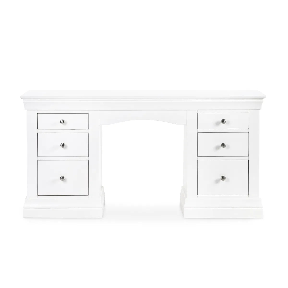 The Clermont Dressing Table in Surf White or Light Grey brings a touch of French elegance to your bedroom or dressing area. Its striking surf white or light grey lacquered finish, with simple clear lines, creates a sense of light and space, seamlessly blending into both contemporary and traditional settings. Crafted from durable Pine and MDF, the design features brushed steel handles for a sleek touch. With six pull-out drawers, there's ample room to organise all your accessories and essentials. Assembly is simple—just attach the handles, and you're set.