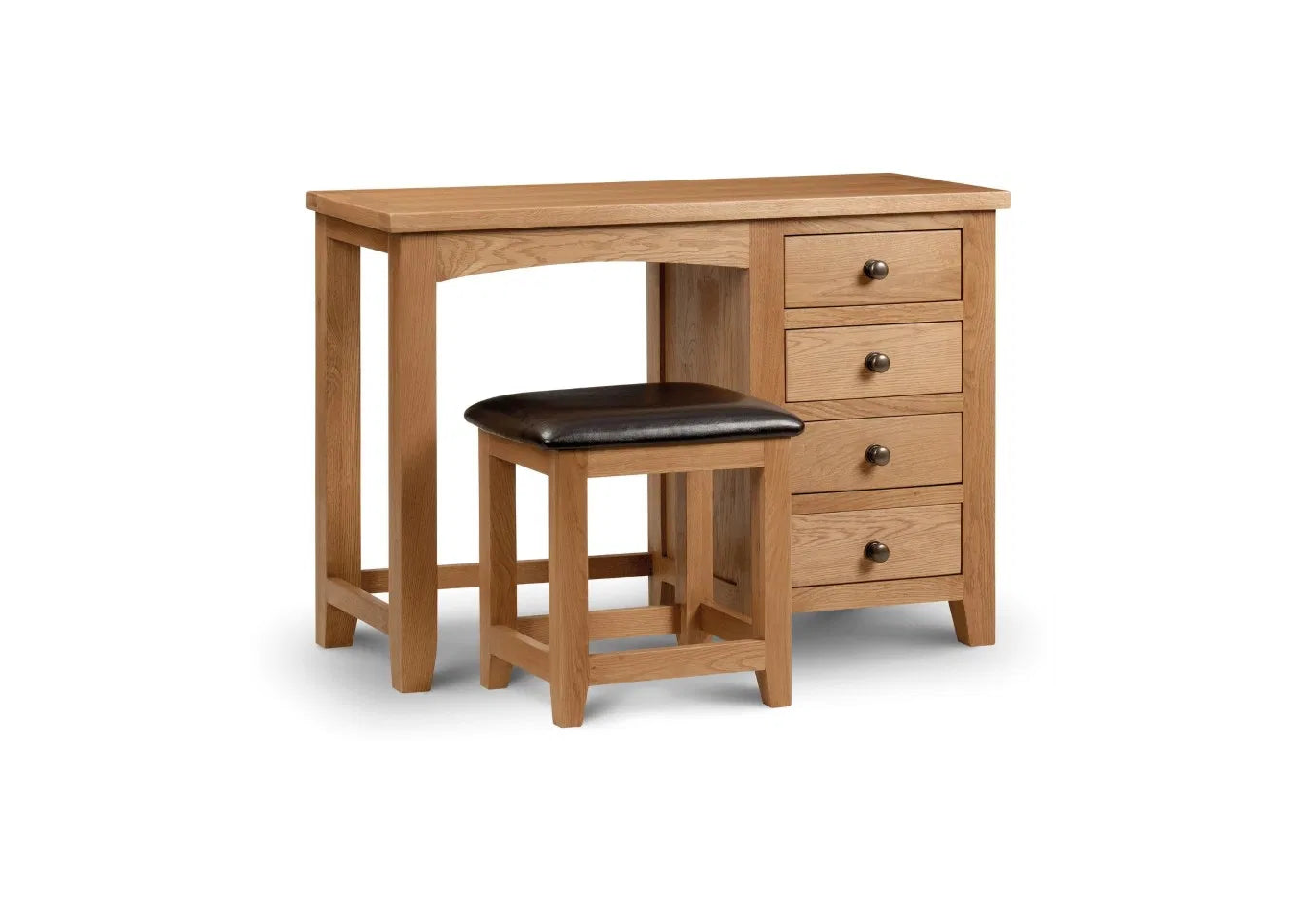 Marlborough is a bedroom range with a classic and timeless design, beautifully constructed using the finest White Oak and Oak Veneers and which complements both traditional and contemporary decor beautifully. The Marlborough Oak Single Pedestal Dressing Table has a 30mm chunky top, clean lines and a sumptuous waxed finish. Drawers are constructed with Dovetail Joints.