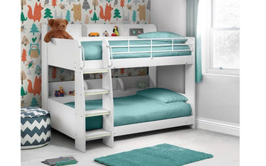 The Domino bunk combines white effect foil to create this stylish bunk bed. Unique to this product is the added shelving along the back of each bunk to give that much needed additional storage space. Another nice feature of the Domino is the Luminous ladder steps that glow in the dark!Height: 161cm x Length x 199cm Width 137cm
