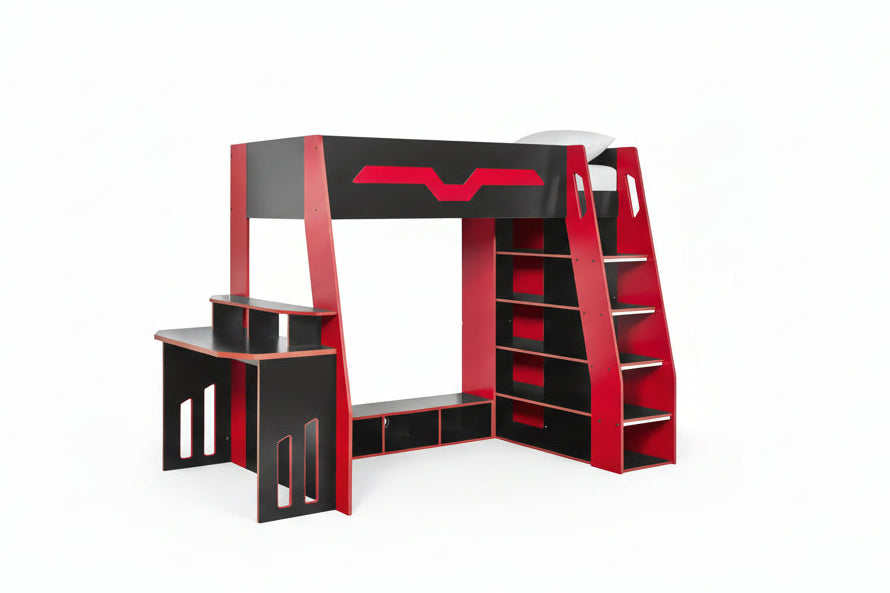 Refresh your child’s bedroom with this ultra-functional high sleeper bed, designed to maximise both space and style. Finished in a bold black and red colourway, this modern loft bed adds energy to any kids' room while freeing up the floor below for creative use—whether for studying, playing, or storage. The sturdy built-in ladder offers safe and easy access to the raised sleeping area, and the integrated desk provides a dedicated study space that can be positioned inwards or outwards to suit your layout. Crafted from durable materials for lasting stability, this high rise bed is a smart solution for growing needs. Mattress sold separately.