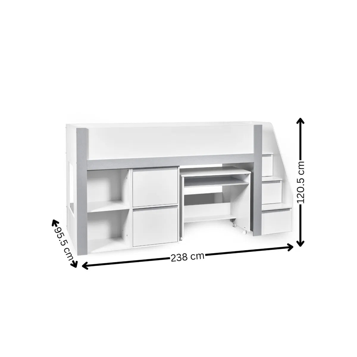Make the most of your child’s space with this functional and stylish mid sleeper bed, designed to support sleep, study, and storage all in one compact footprint. Finished in a sleek white and silver colourway, this contemporary mid sleeper bed fits seamlessly into modern kids’ bedrooms. It features a pull-out desk on smooth castors, integrated drawers, and open shelving compartments—perfect for keeping books, toys, and school supplies neatly stored. The fixed ladder includes hidden cupboard storage, offering additional convenience without taking up extra room. Built from durable wood, it's a smart, long-lasting solution for growing families. Mattress sold separately.