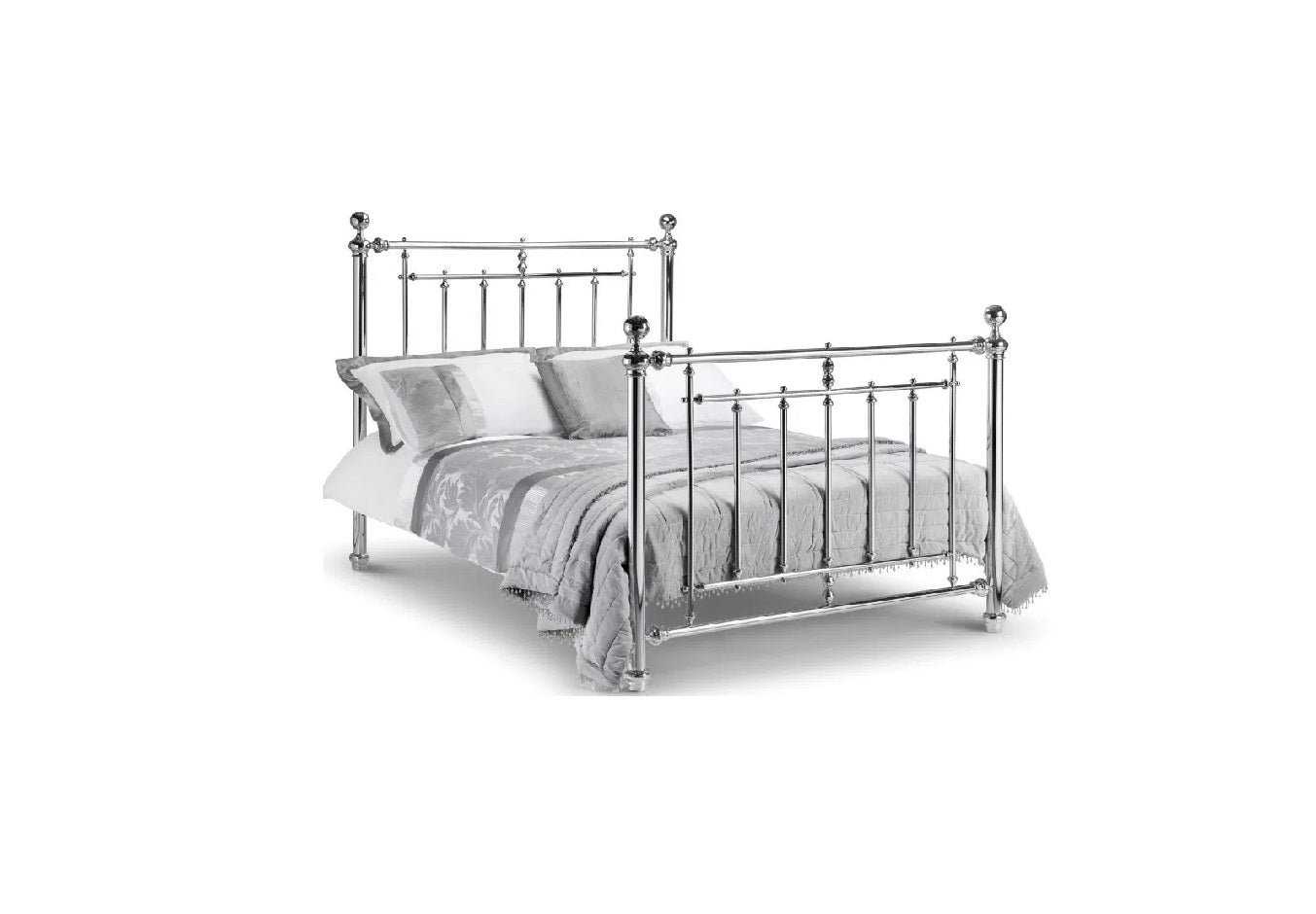 The Empress is an extremely imposing and impressive chrome bed. Its high headboard and matching footboard create a real wow factor, with the overall effect enhanced by exquisite, highly detailed finials and castings. A sprung slatted base ensures added comfort and prolonged mattress life. A stunning centrepiece for any bedroom.