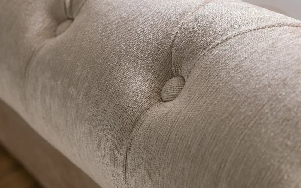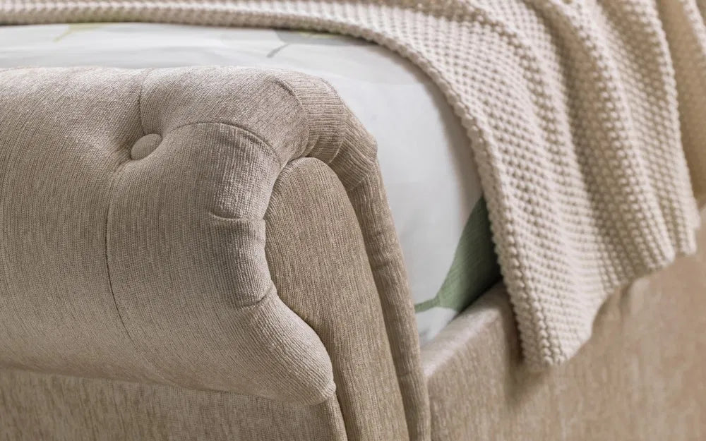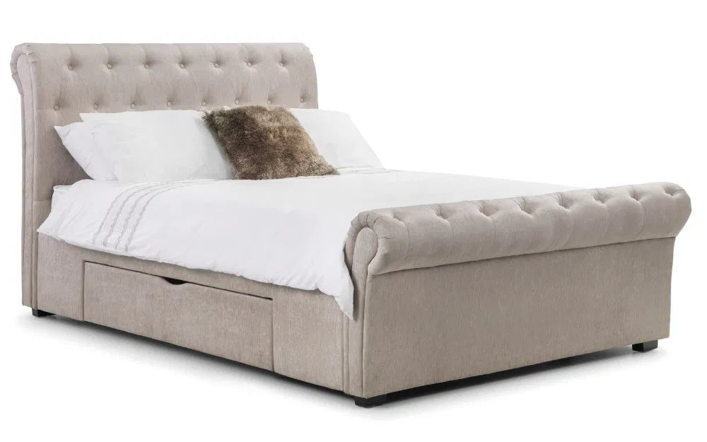 Ravello is a stunning fabric bed in a classic scroll design, finished in a lovely soft touch mink chenille. It is a substantial bed characterised by exquisitely finished, sumptuous upholstery and a striking deep buttoned, high headboard with matching footboard. Two large under bed drawers add phenomenal amount of storage space. Ravello adds a wow factor to any bedroom and is a perfect match for traditional and contemporary interiors alike. A sprung slatted base ensures extra comfort and prolonged mattress life.