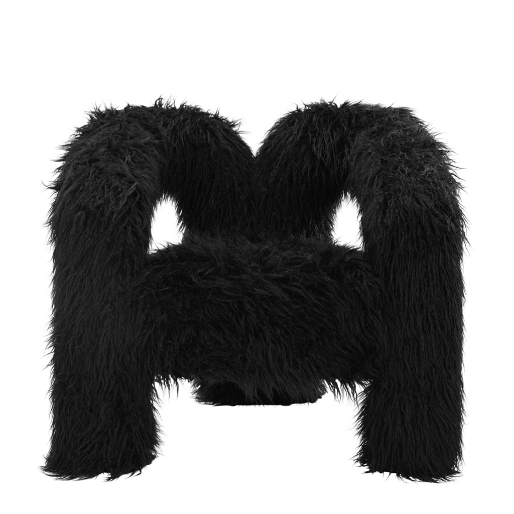 The Freyja Jet Chair is upholstered in faux Mongolian fur, creating a bold, tactile statement. Designed as an extra-large accent chair, it features a striking curved three-leg base that enhances its modern silhouette. A true statement piece, it brings contemporary drama and comfort to any interior.