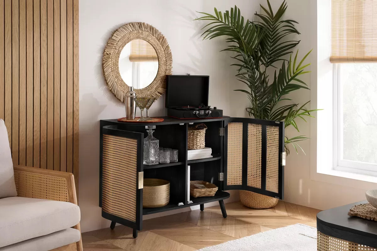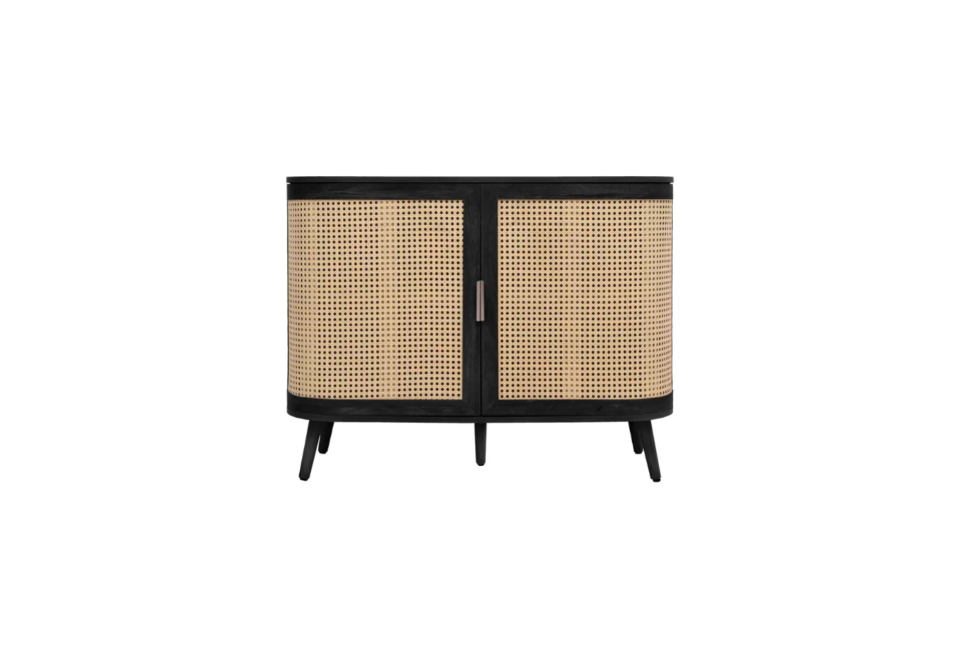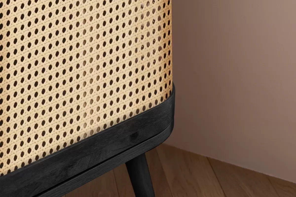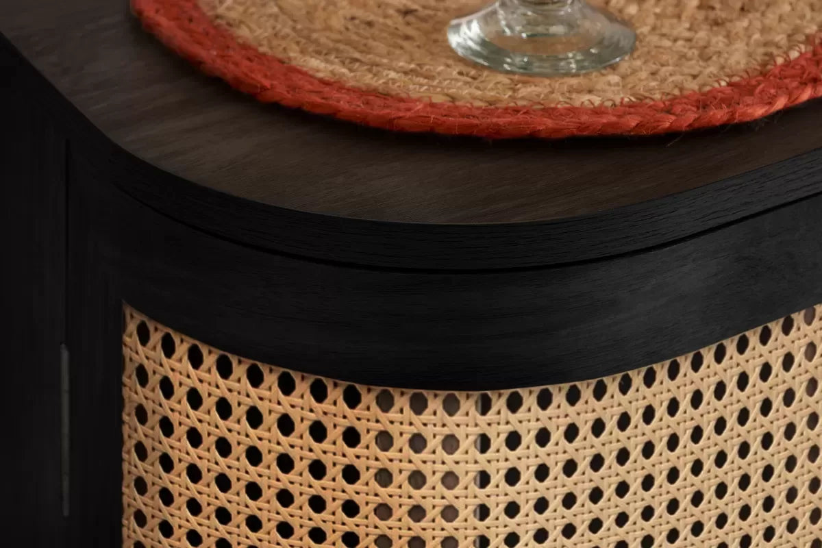Each curve is thoughtfully softened, featuring delicate bevels that whisper a modern sensibility. The rattan front is meticulously woven, presenting a pattern that is both eye-catching and gracefully reserved. The warm, neutral palette ensures versatility, while the smooth wooden surfaces invite a tactile experience.