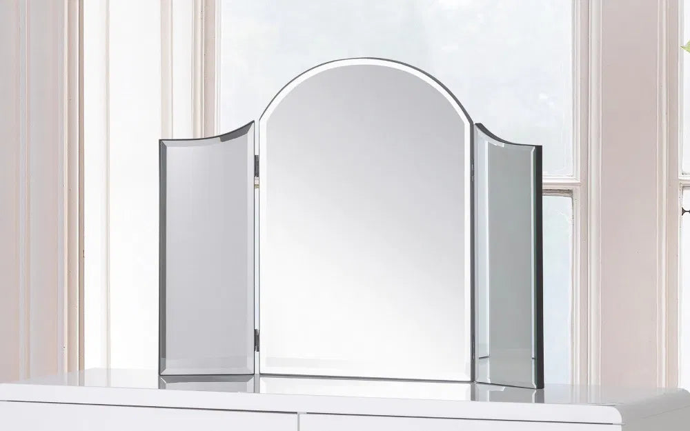An elegantly styled free standing dressing-table mirror whose subtle curved design adds a touch of glamour to any bedroom.