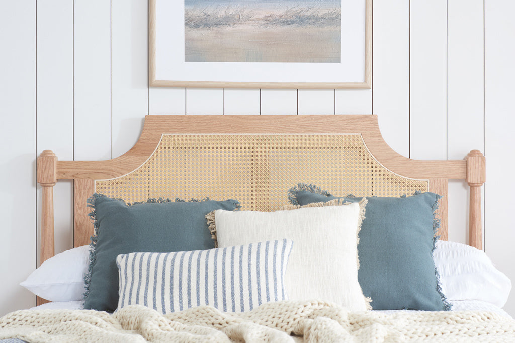 Where timeless elegance meets the unmatched warmth of natural materials. The Geneva bed is expertly crafted from the finest material. This bed frame reveals the enchanting patterns of oak grain, imparting a sense of earthy richness to your bedroom sanctuary. Both the headboard and footboard are adorned with exquisitely woven rattan, blending traditional artistry with a touch of contemporary flair.