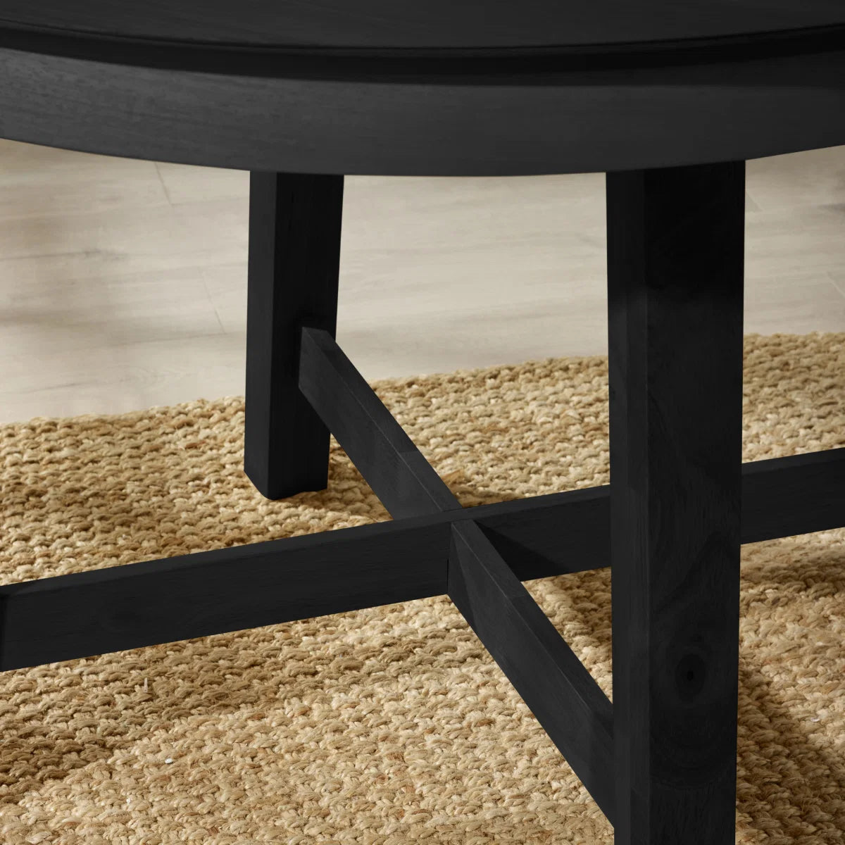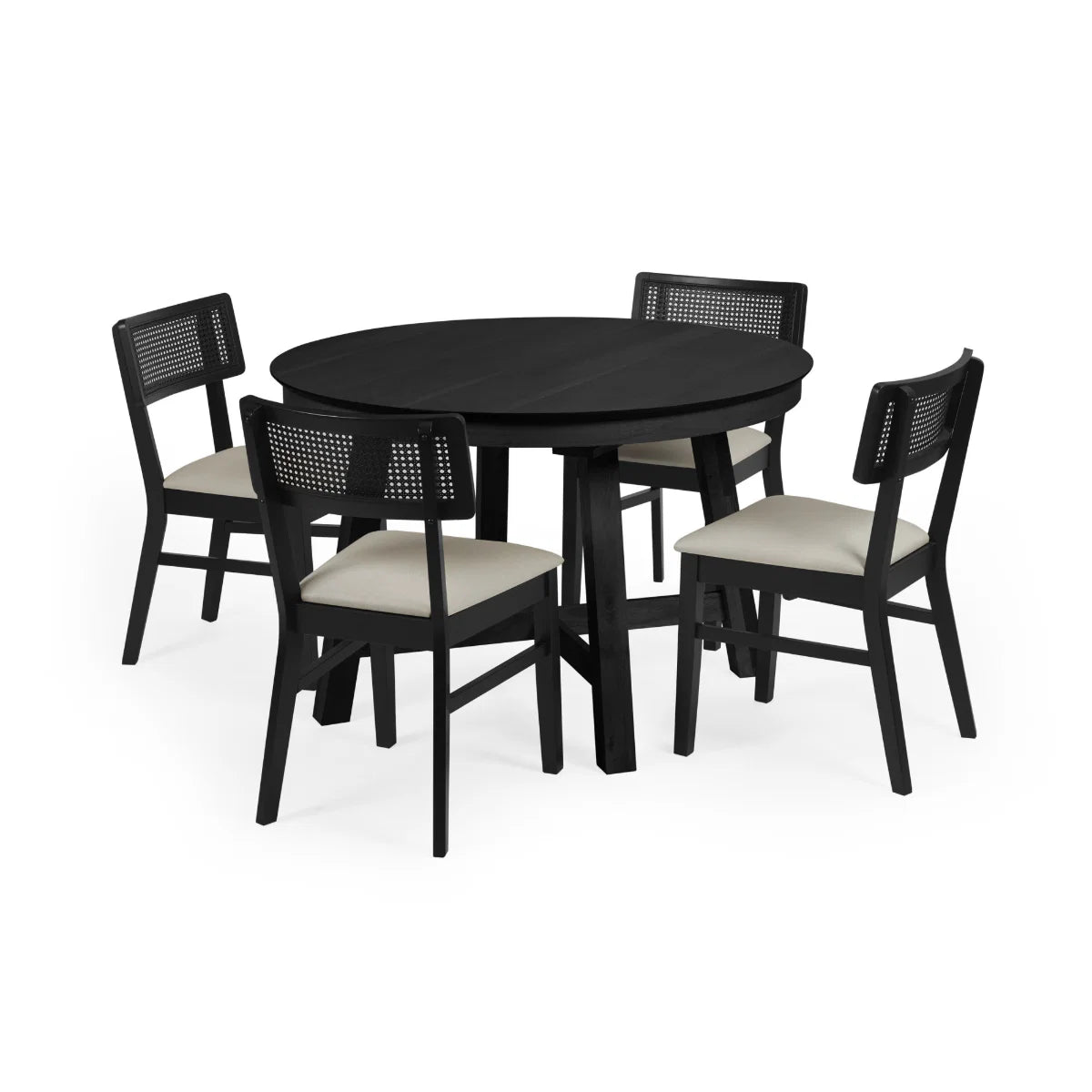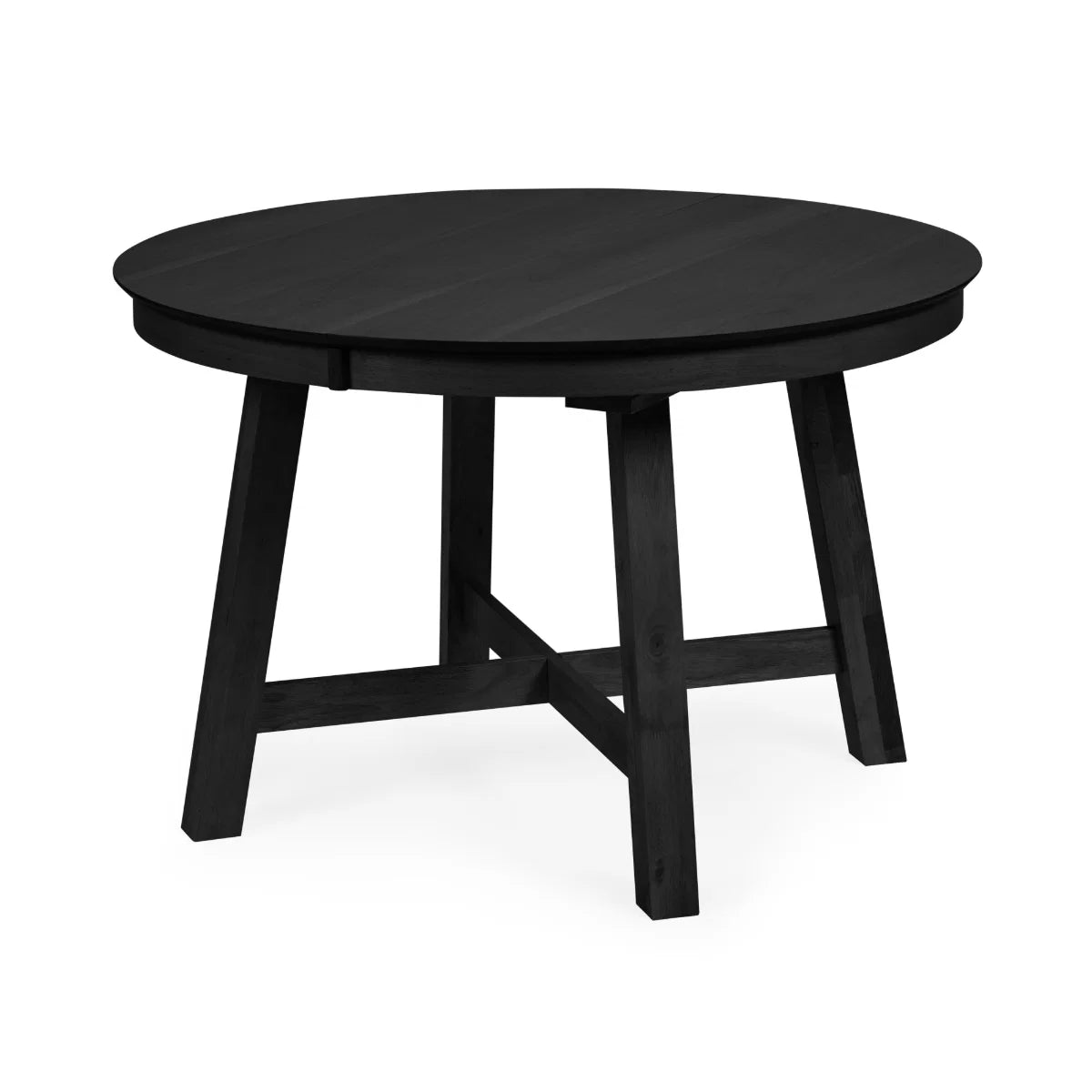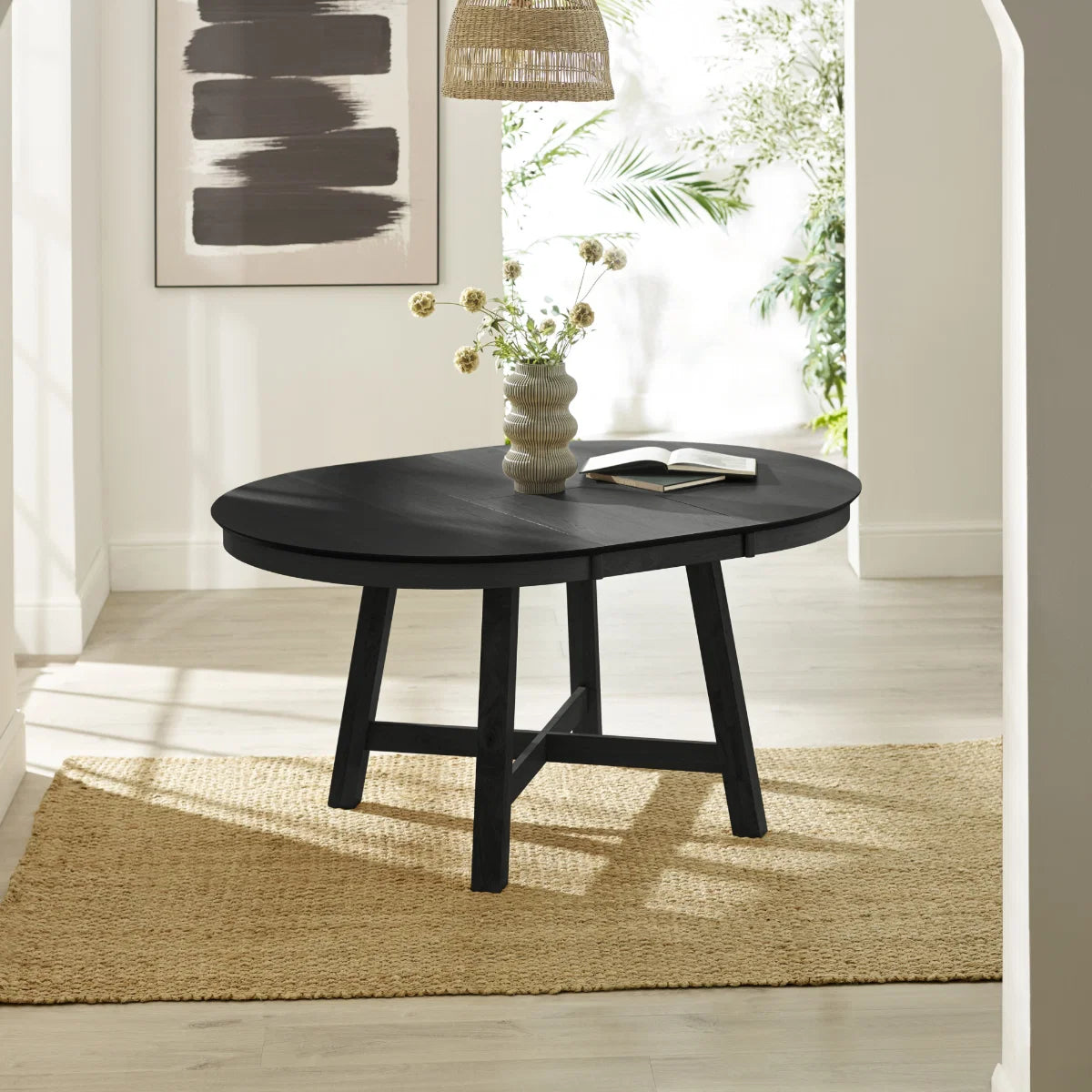 Add modern style and natural character to your dining space with this beautifully designed round extending dining table. Finished in a sleek satin black tone, it offers a contemporary look that complements a wide range of interior styles, from modern minimalism to relaxed, nature-inspired homes. The tabletop is crafted from engineered wood with an oak veneer, allowing the natural wood grain to subtly show through the satin black surface. This creates a balance of warmth and modern sophistication while maintaining a durable surface for everyday use. The table is supported by solid wood legs, designed to provide strength and stability while adding a refined architectural touch to the overall design. Reinforced metal elements within the structure further enhance durability. Ideal for kitchens, dining areas, or breakfast nooks, the round shape encourages relaxed dining and easy conversation. Full assembly is required, with clear instructions included for straightforward setup.
