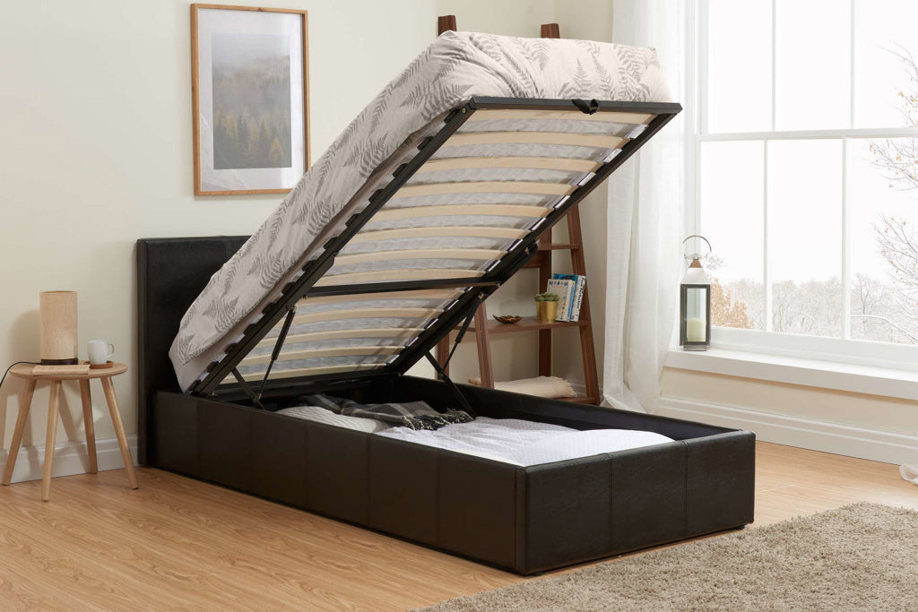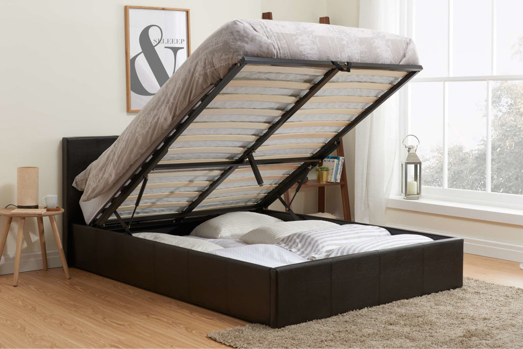 With strong gas-lifts to access the storage space, this frame is available upholstered in steel, black crushed velvet and grey polyester.