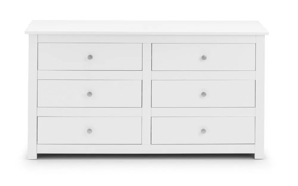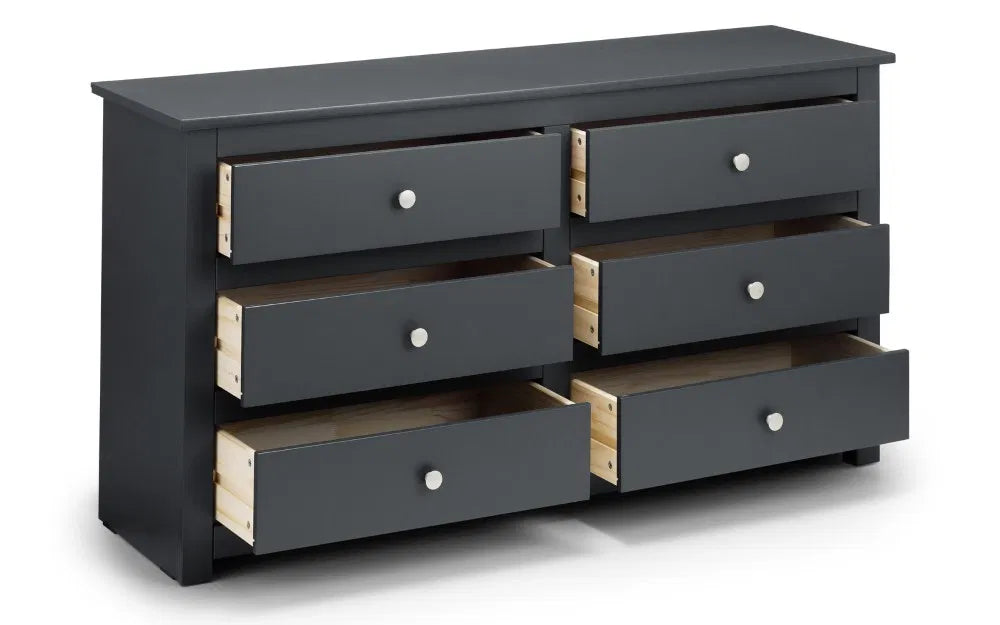 Boasting clean, simple lines the Radley 6 drawer chest is perfectly suited for both modern or traditional styles. Featuring six generously sized drawers, to keep your bedroom neat and tidy. Finished in a surf white or anthracite lacquer, with delicate silver handles, the Radley Bedroom Collection is perfect for adult and kids bedrooms.