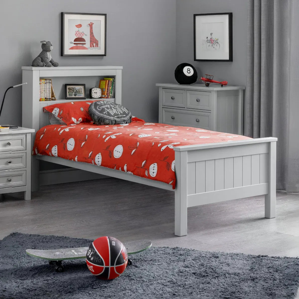 The Maine Bookcase Bed features a high headboard with a shelf, perfect for storing books at arms reach for your evening read! Crafted from MDF with an exquisite dove grey lacquer, this bed features New England style panelling on the headboard creating a timeless appeal. A solid slatted base ensures supreme comfort and prolonged mattress life. The perfect match for the Maine Underbed, creating a space saving solution perfect for sleepovers!