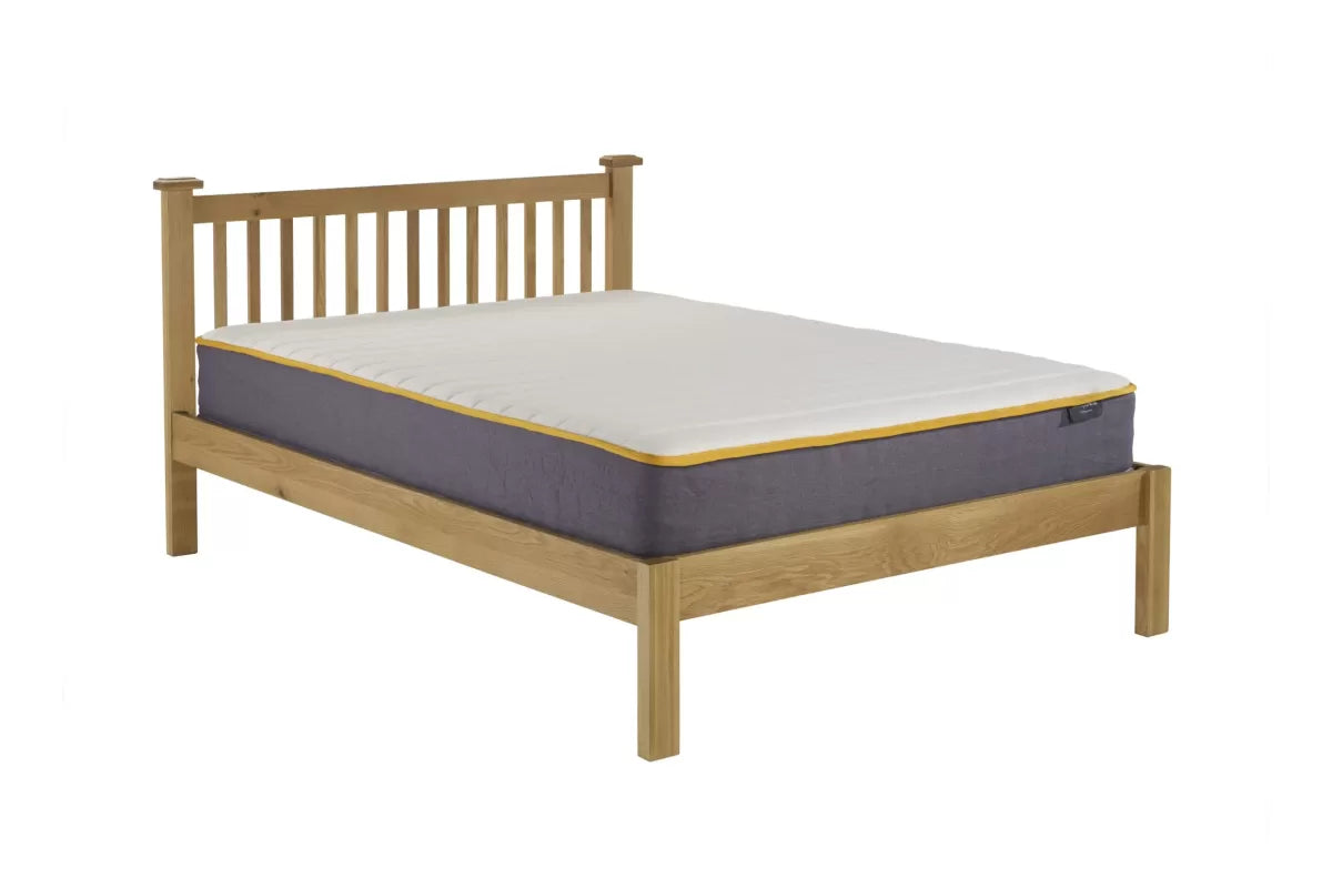 This chunky bed features a classic construction with a slatted headboard and matching low foot end.
