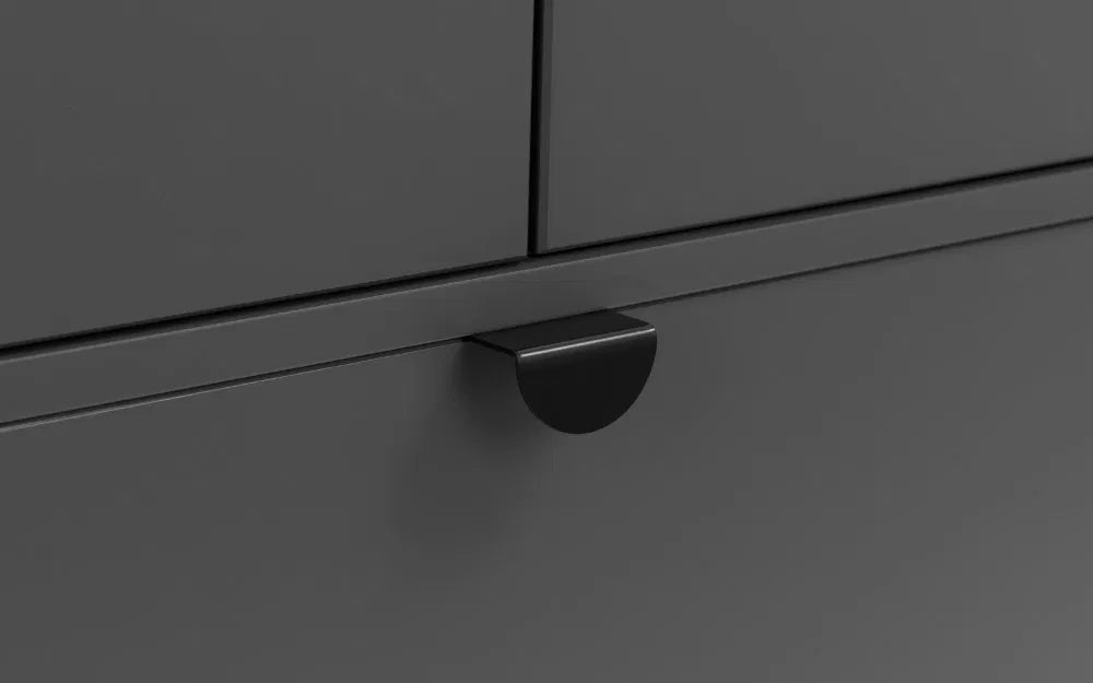The Chloe Bedroom collection has a modern, retro style finished in a storm grey lacquer with satin black wooden legs and handles. The corners are rounded for a softer look, creating perfect balance between style and functionality. This wardrobe features a large hanging area behind 2 doors, along with a drawer for additional storage.