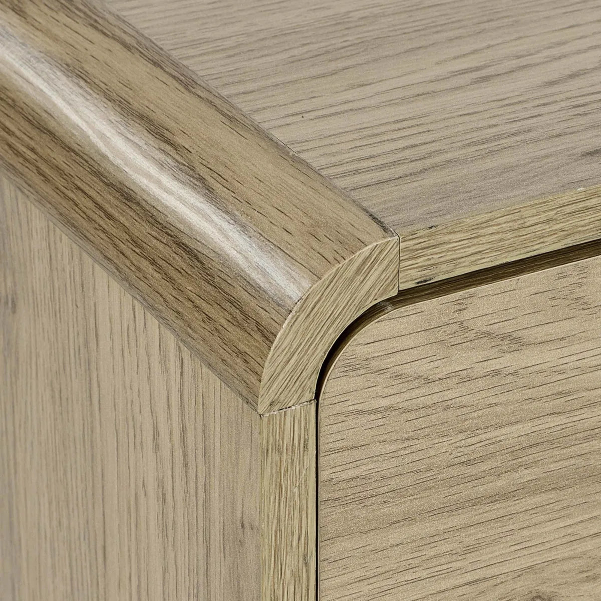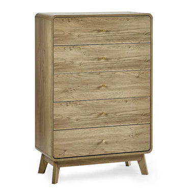 Maximise storage without sacrificing style with the Ingrid 5 Drawer Chest. This tall, elegant piece adds warmth and character to any room with its textured wood-effect finish. The gently curved edges and gold-tone handles enhance its sophisticated look, while five spacious drawers offer ample storage to keep your belongings neatly organised. Easy assembly ensures quick enjoyment.