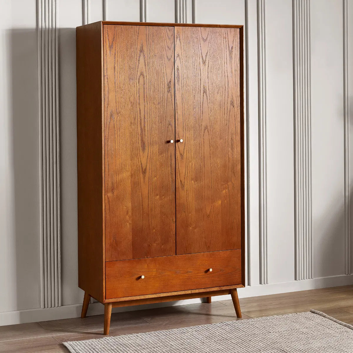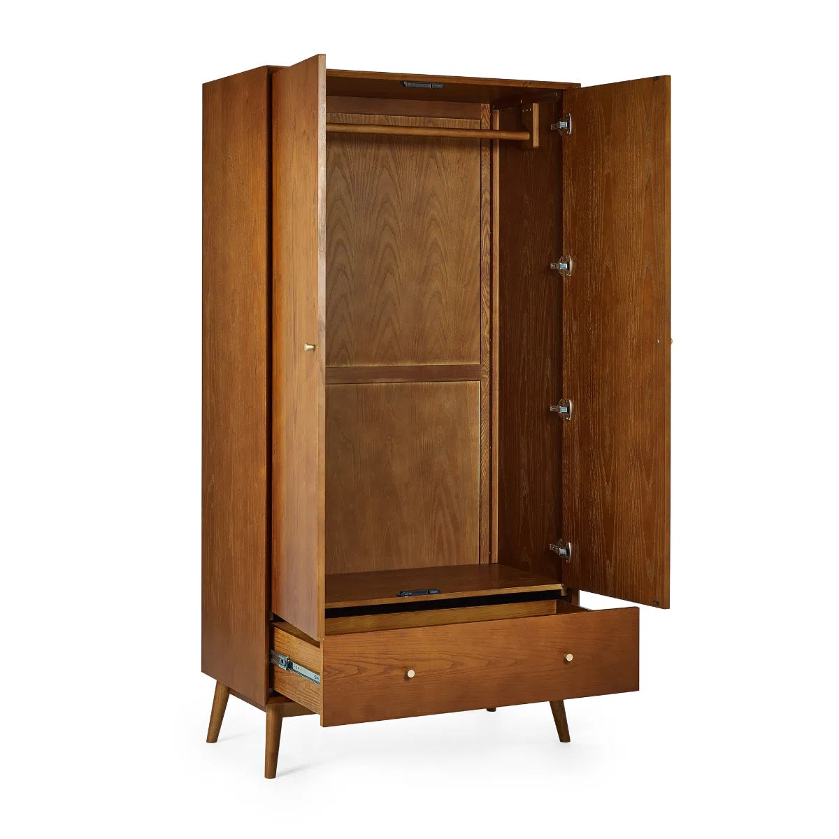 A gorgeous retro-inspired style, the Lowry Wardrobe is constructed from an exquisite cherry ash wood veneer with beautifully tapered legs. Featuring 2 soft-touch doors with 1 drawer offering plenty of hanging and storage space. Complemented by golden framed knobs, providing the perfect timeless staple to any bedroom space.