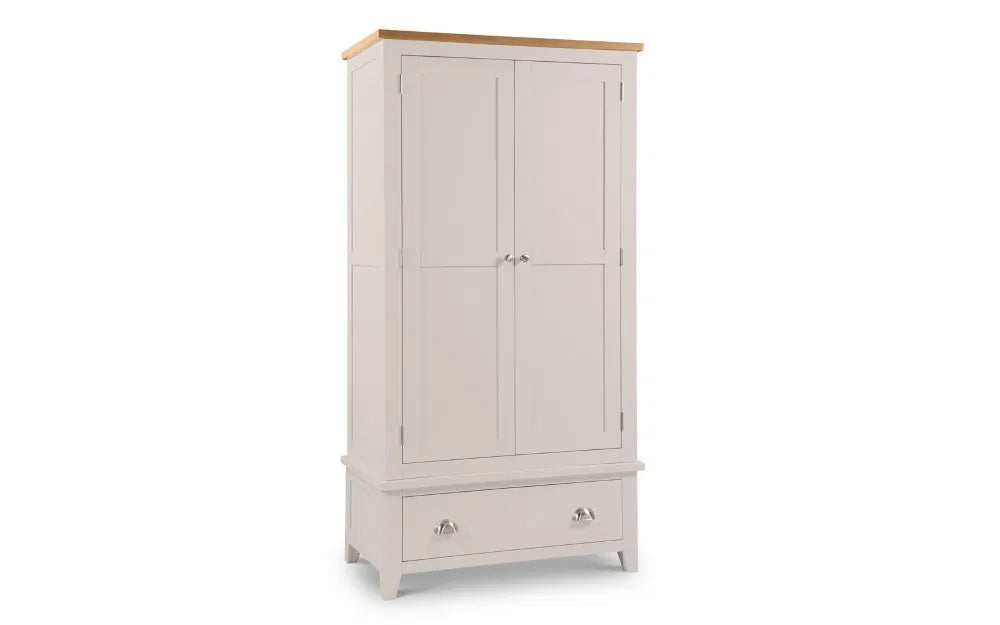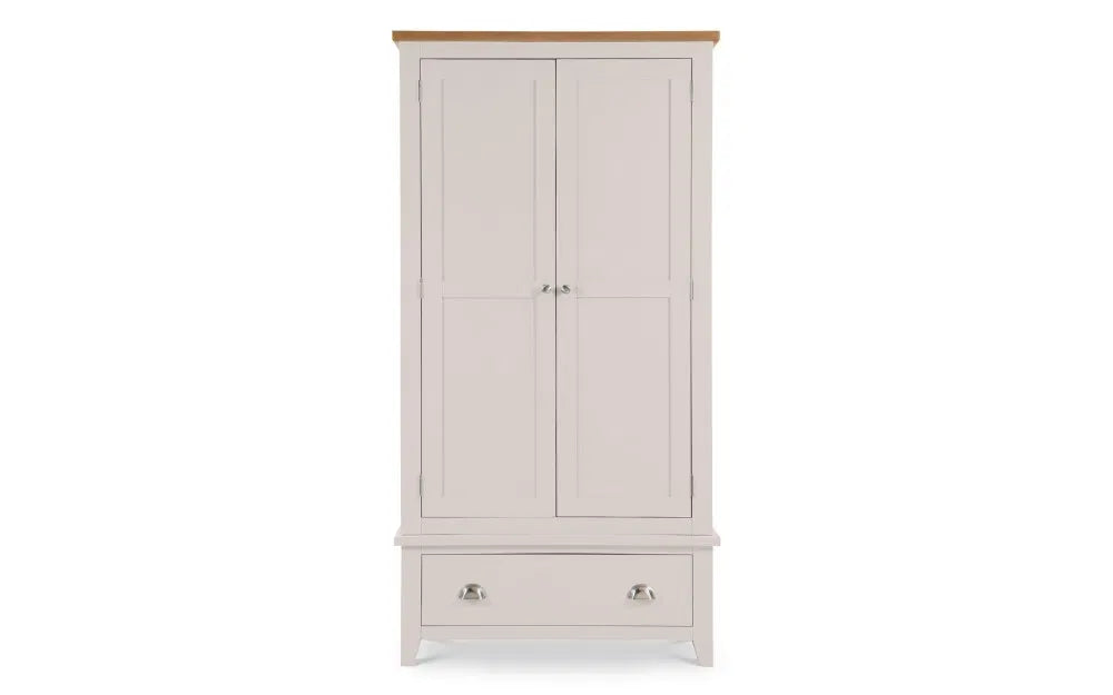 Finished in a elephant grey lacquer, the Richmond bedroom range is a timeless, elegant design suitable for a wide range of décor. Constructed from white oak and oak veneers, this lacquered bedroom range brings a modern twist on a traditional construction. With ample hanging space behind two doors, and two storage drawers, this 2 door combination wardrobe meets all your needs for spacious storage for your clothes.